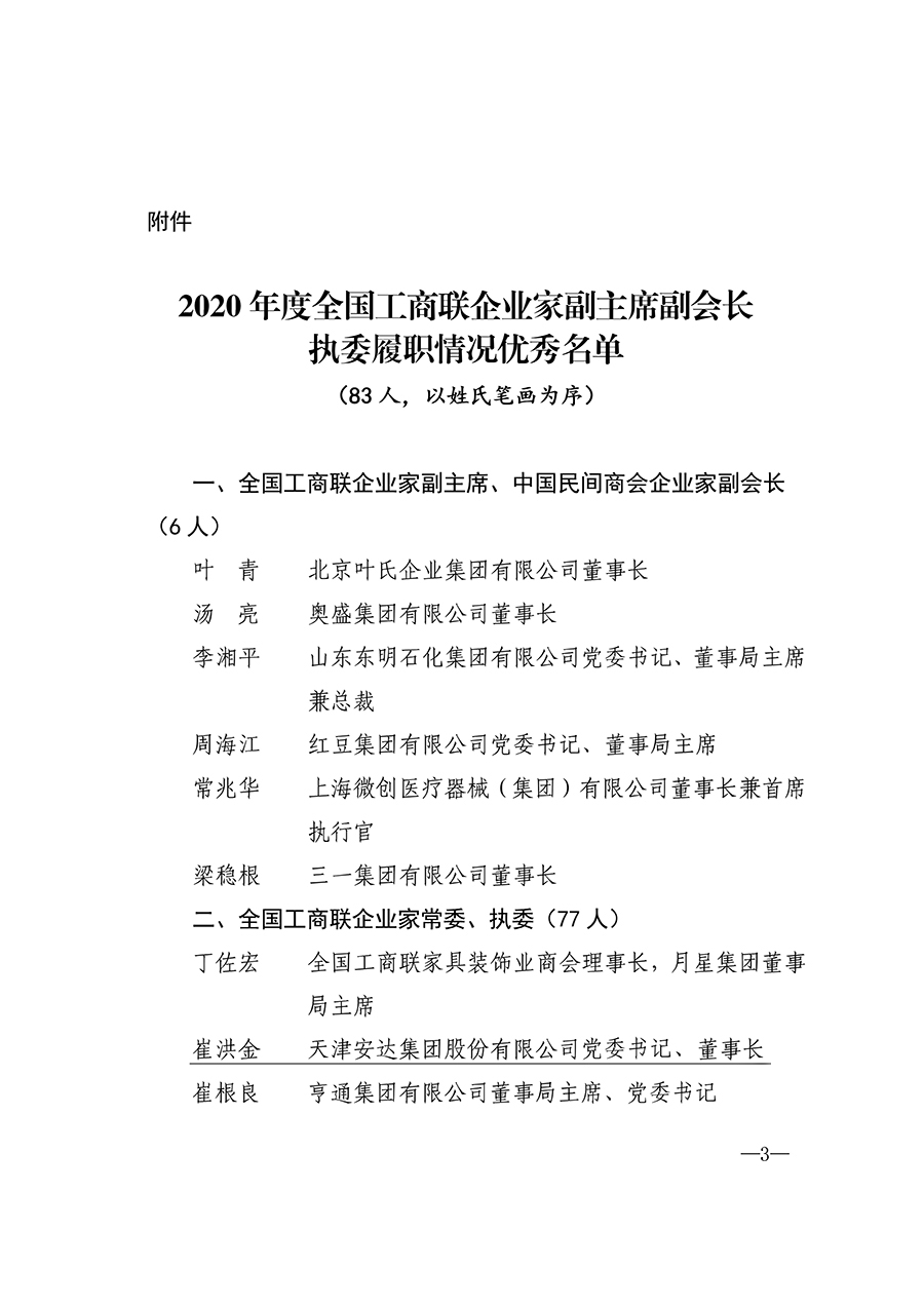 13日2021-09近日,全國工商聯發布《關于對2020年度履職情況優秀的全國工商聯企業家副主席副會長執委給予表揚的通報》。《通報》指出,2020年度面對突如其來的新冠肺炎疫情沖擊影響,各位企業家副主席、副會長、執委認真學習貫徹習近平新時代中國特色社會主義思想,以實際行動響應中央號召,積極投身抗擊疫情狙擊戰,...[查看詳情]