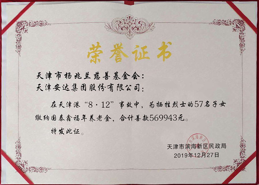 2015年天津市楊兆蘭慈善基金會、天津安達集團捐款,為在天津港“8.12”事故中,不幸犧牲烈士的57名子女通過人保繳納國泰鑫福年養老金,合計57萬余元。對于安達集團崔洪金董事長的這份暖心善舉,濱海新區慈善協會會長張傳捷攜濱海新區民政局相關領導親自登門感謝,將這份沉甸甸的獎狀送到崔洪金手里,以示表揚和鼓勵。