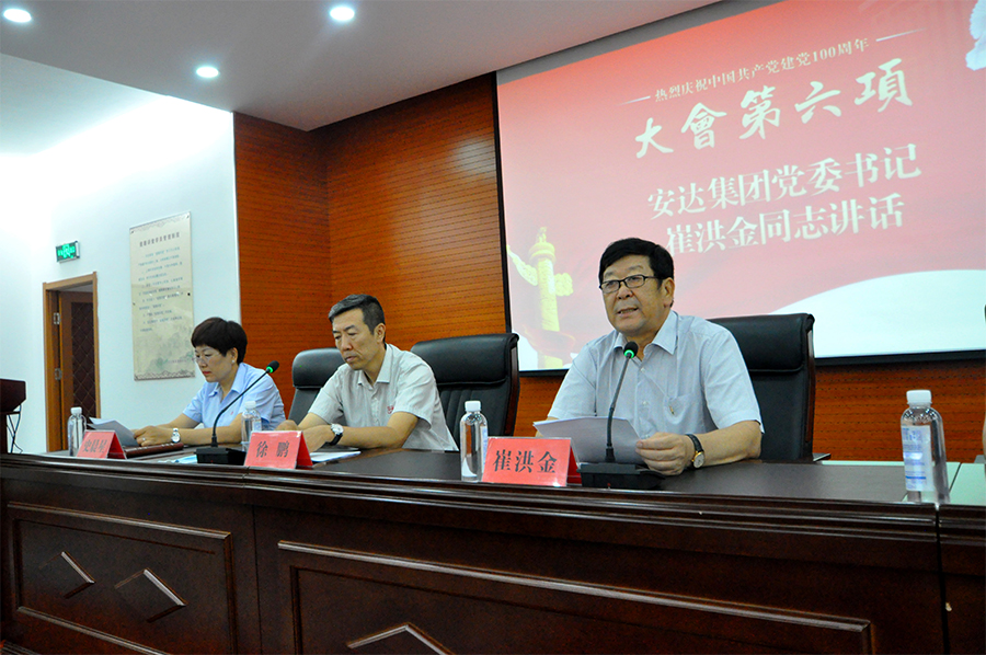 隨后,召開建黨百年?安達集團優(yōu)秀共產(chǎn)黨員和先進基層黨組織表彰大會。大會在雄壯的國歌聲中拉開帷幕,根據(jù)會議議程集團黨委委員徐鵬同志宣讀《關于表彰優(yōu)秀共產(chǎn)黨員和先進基層黨組織的決定》;集團黨委書記崔洪金和黨委委員徐鵬、鄭玉強、鄭寶彥、史晨星為優(yōu)秀共產(chǎn)黨員和先進基層黨組織頒獎;第一黨支部何秀翠、第二黨支部劉東旺兩名同志作為先進代表作大會發(fā)言;集團黨委書記、董事長崔洪金同志作重要講話,并領誓重溫入黨誓詞。最后在高唱《沒有共產(chǎn)黨就沒有新中國》中落下帷幕。
