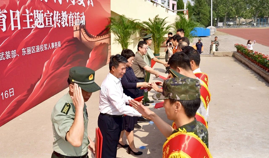 活動中,在場領導為區退役軍人事務局老兵宣講團、區“強軍理論優秀教員”、區“最美擁軍人物”、“最美退役軍人”代表組成的東麗區全民國防教育宣講團頒發聘書。中國民航大學學生代表、典型模范代表、新立街道、退役軍人事務局相關負責人做了表態發言。