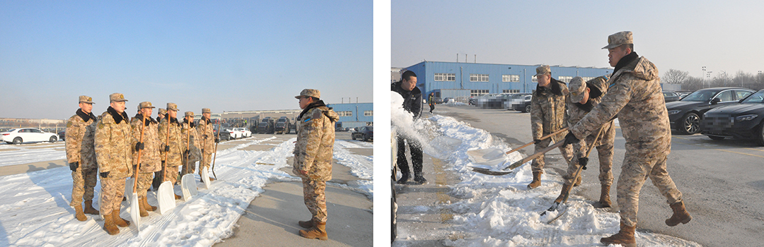 2023年第一場大雪后,寒風(fēng)凜冽,風(fēng)雪無情,路面積雪嚴(yán)重影響著人們的出行,特別是安達(dá)物流院內(nèi),天氣寒冷,再加上積雪路面因車輛的反復(fù)駛過已造成積雪成冰,雖然物流工作人員經(jīng)過一周的清理,但還是有一大部分路面未完全清理干凈。天氣寒冷卻阻礙不了軍民共建的愛心,駐區(qū)93688部隊(duì)52分隊(duì)作為安達(dá)集團(tuán)的雙擁共建單位,了解到安達(dá)物流因積雪造成的作業(yè)困難、安全無保障的困境,立馬提出主動(dòng)幫助物流公司清理院內(nèi)積雪。