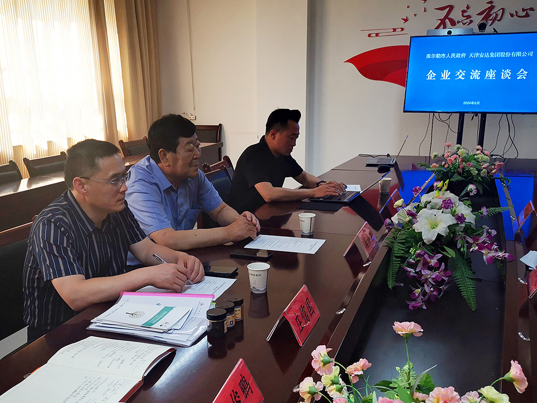 當天下午,庫爾勒市政府副市長楊松波、庫爾勒市商務和工業信息化局黨組書記、副局長王偉,庫爾勒市退役軍人事務局、市容環衛事務中心、商工局、上庫高新產業技術開發區分管領導與安達集團黨委書記、董事長崔洪金,安達集團董事長助理王俊鵬,安達集團分公司天津鴻達精工機械有限公司經理莊儒國以及財金城倉(庫爾勒)環保科技有限公司副總經理吳江濤共同參加座談會。